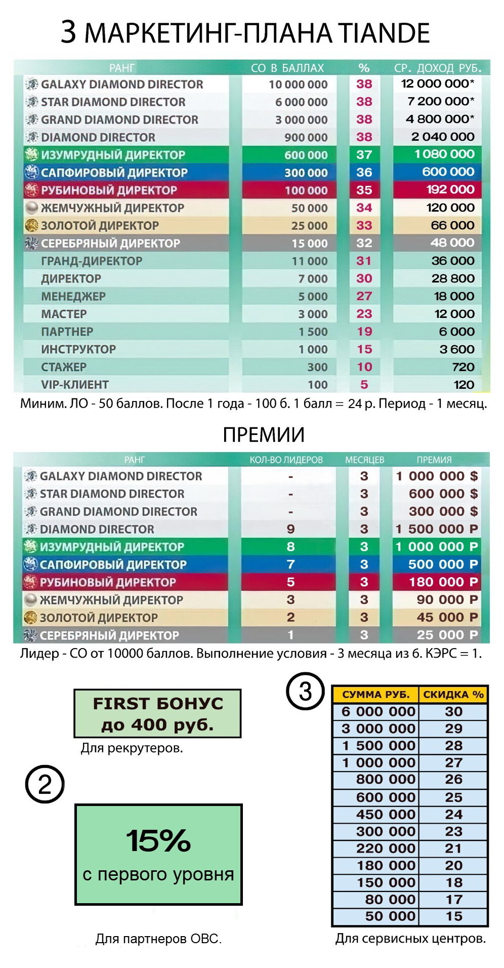 Первый маркетинг-план TianDe - классический, ступенчатый, без отделения лидерской группы. Он позволяет зарабатывать и новичкам, и лидерам. Такие маркетинг-планы имеют преимущества и их используют самые крупные и стабильные сетевые компании в мире.